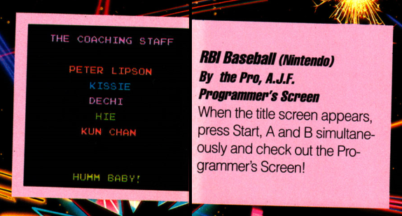 From GamePro 4, a tip on how to see the short credits screen in R.B.I. Baseball.